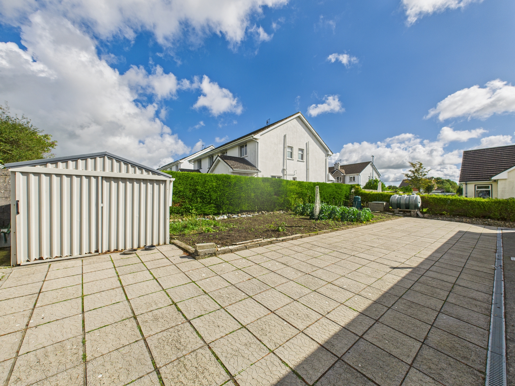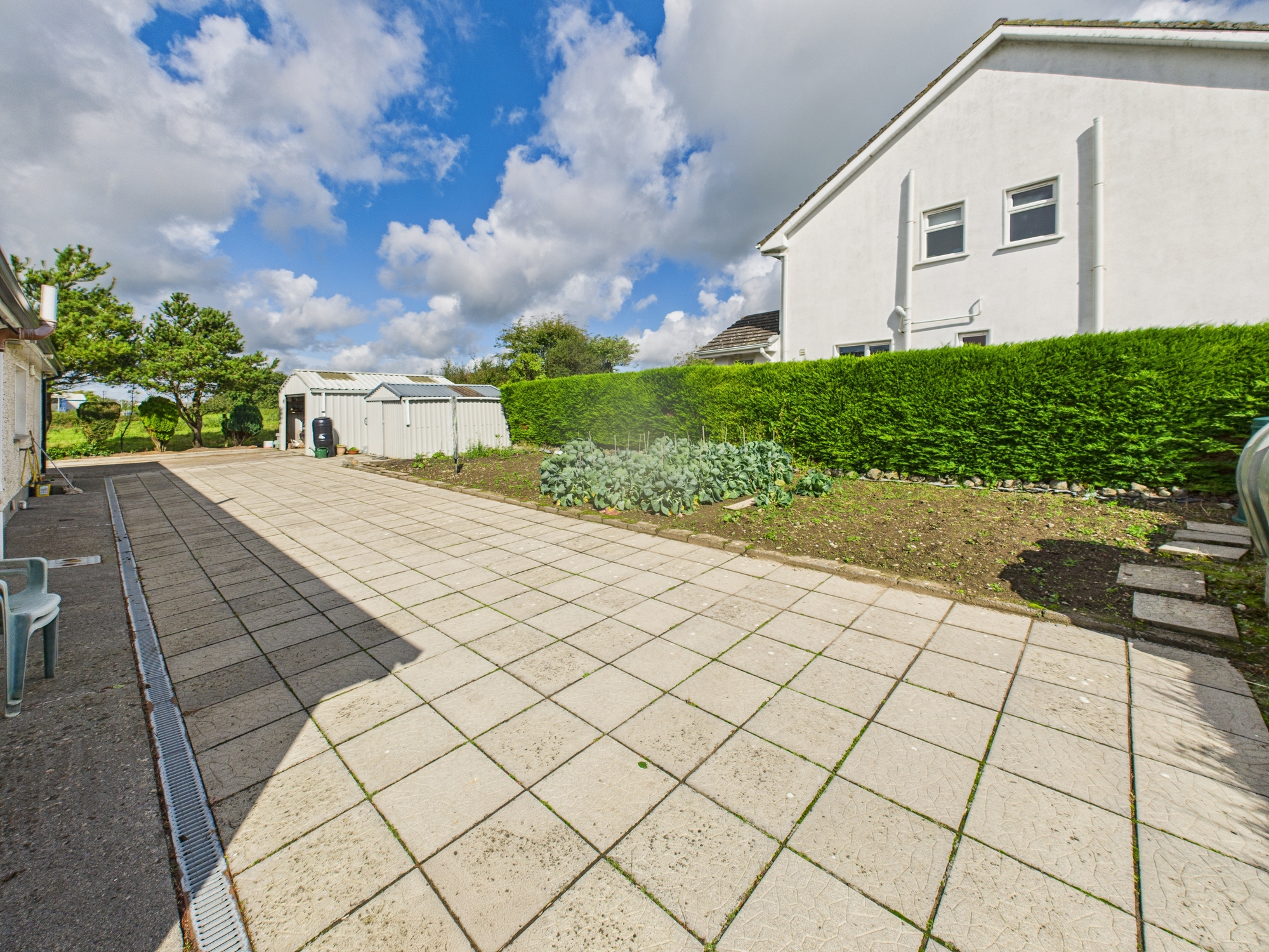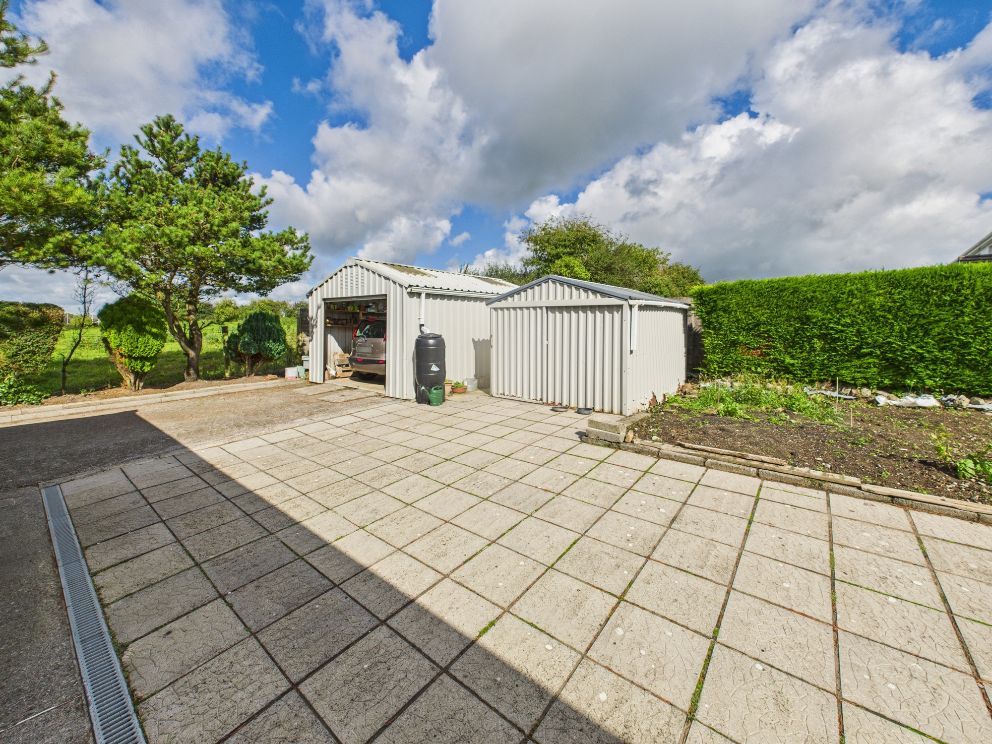Externally, the property sits on a large landscaped site with well-maintained lawns to the front and rear, complemented by a steel shed for additional storage.