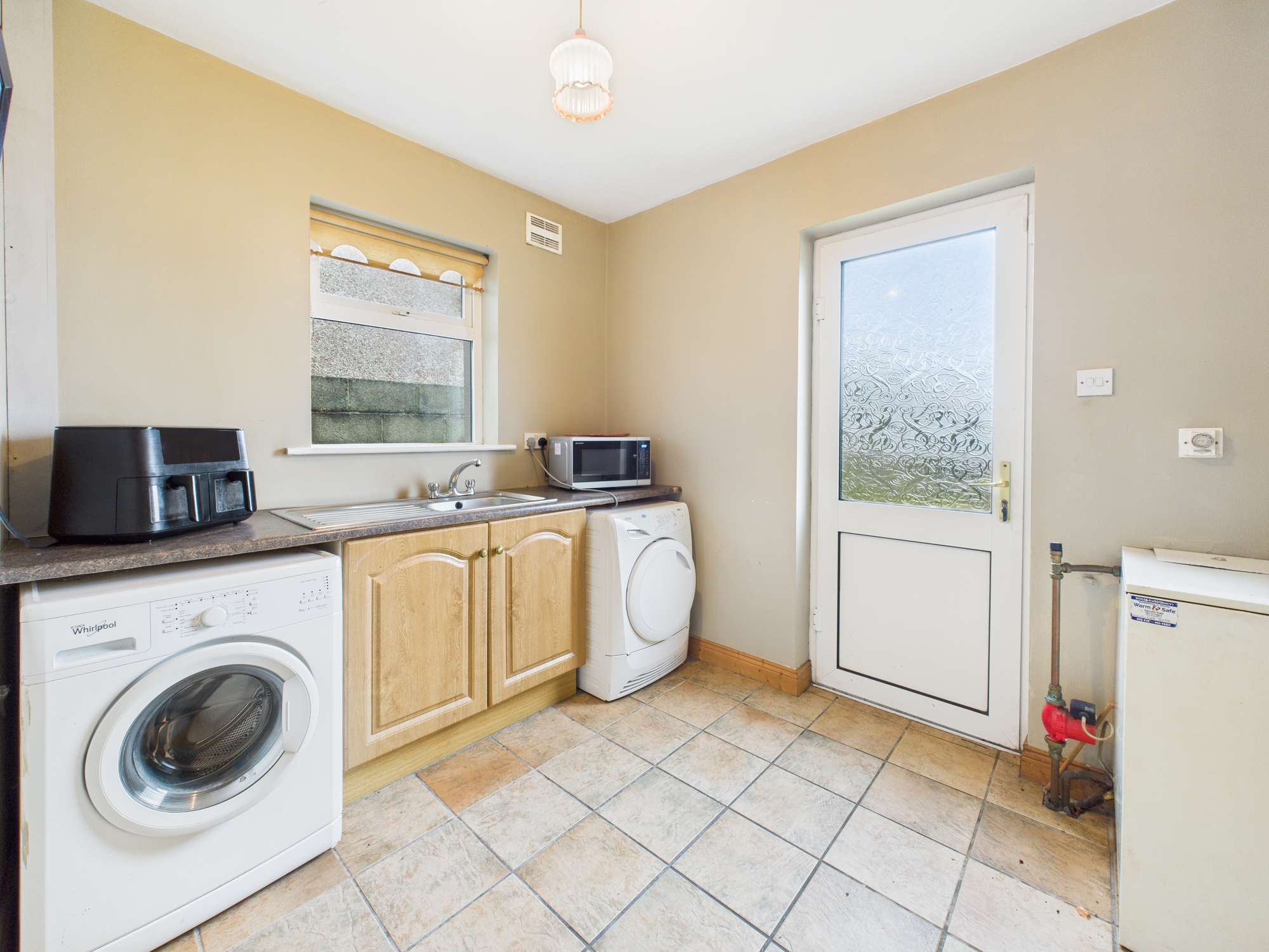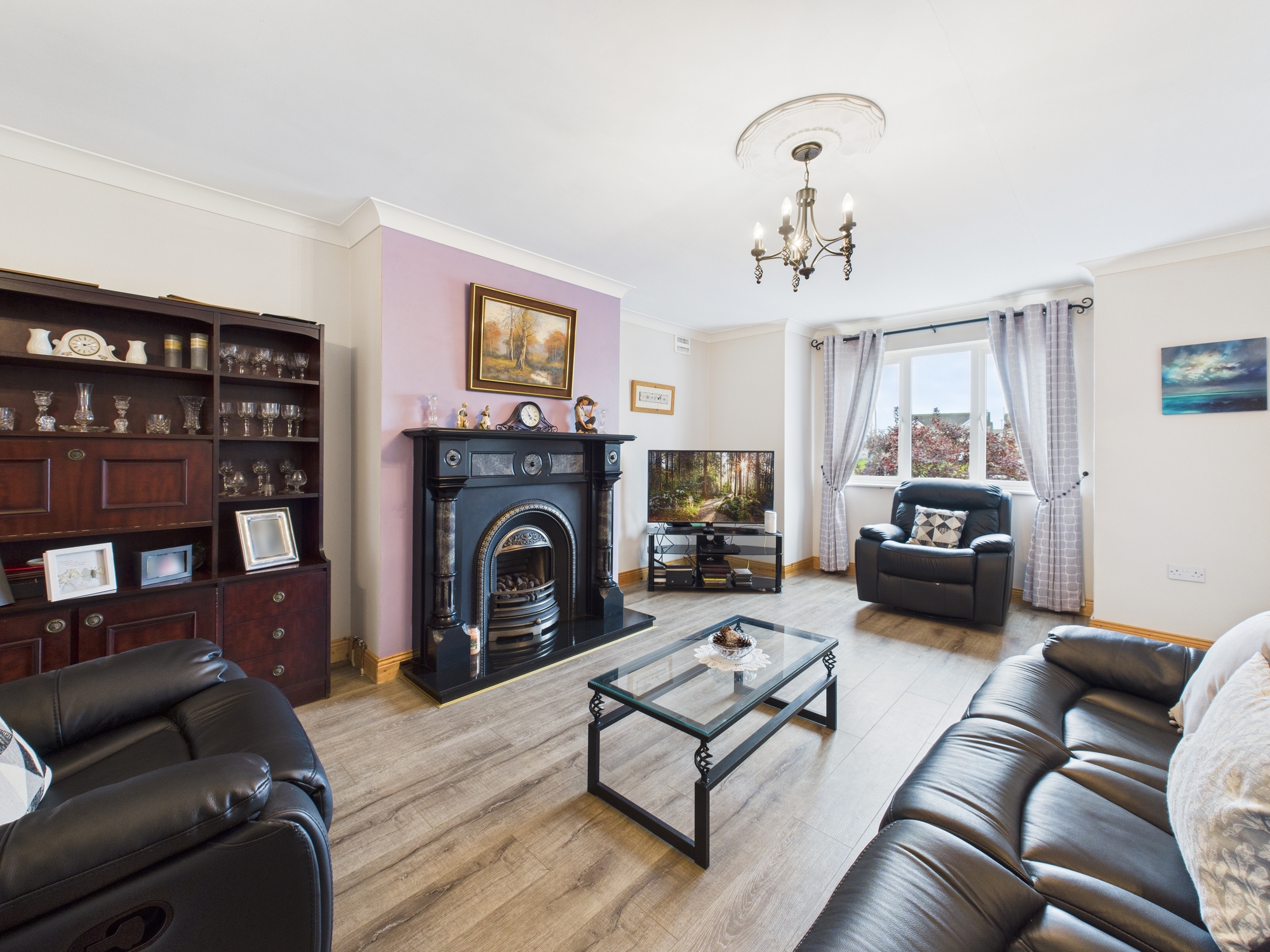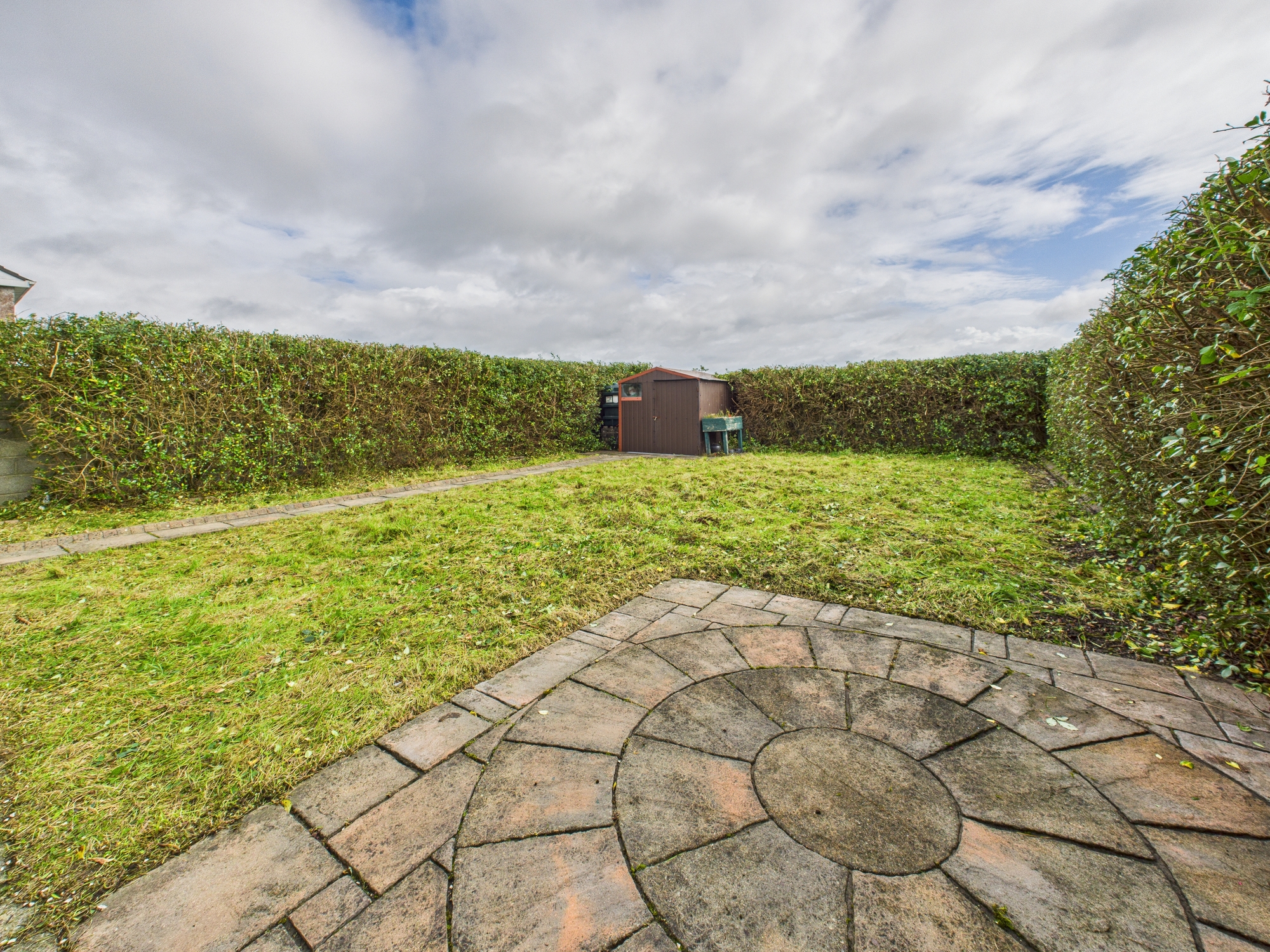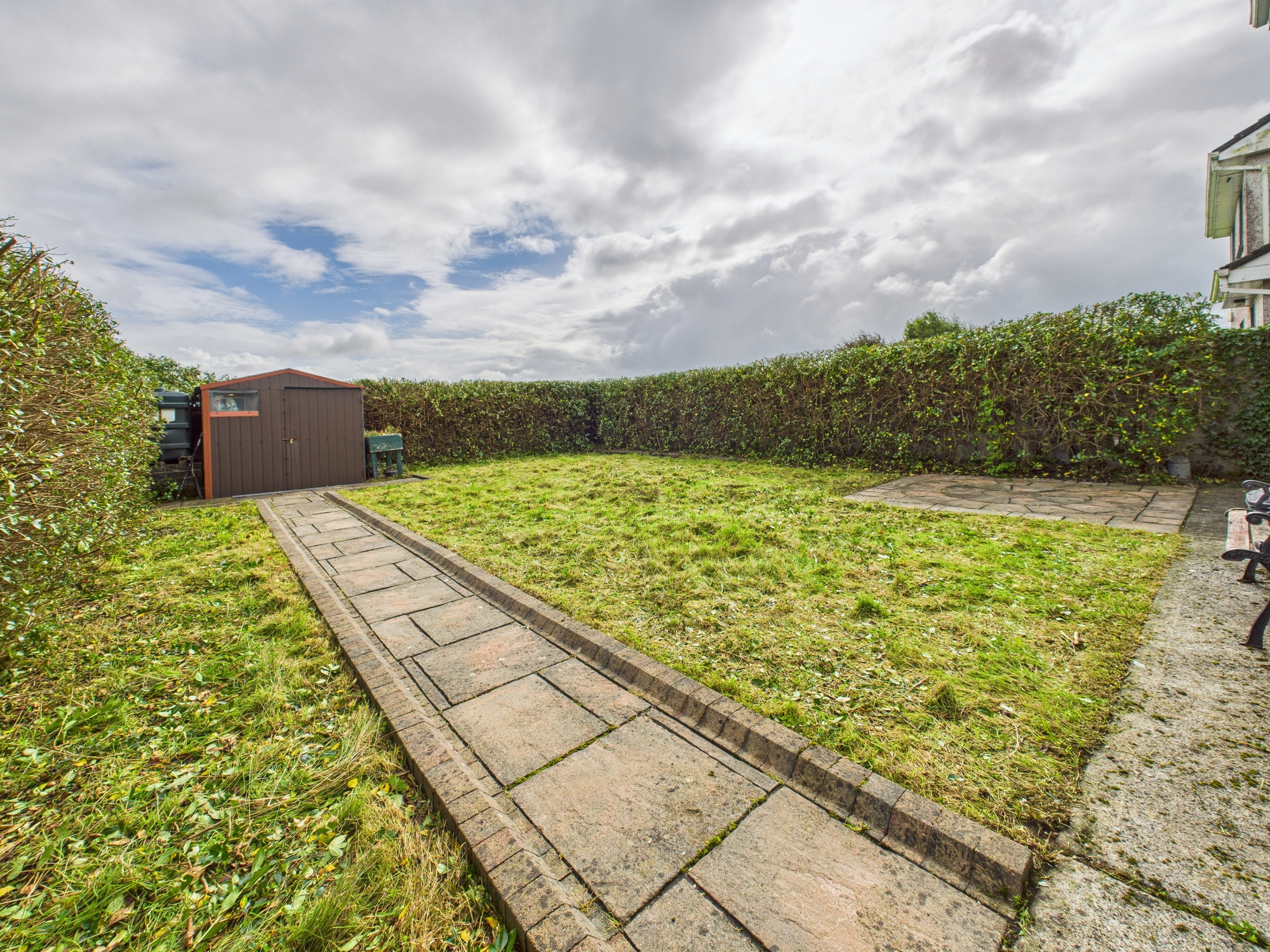 The property boasts a large private rear garden, enclosed with a mature shrub boundary wall, laid lawn, complemented by decorative patio slabsâ??perfect for outdoor dining or relaxation. To the front, a tarmac driveway provides ample parking, alongside a neat lawn area that enhances the property’s kerb appeal.