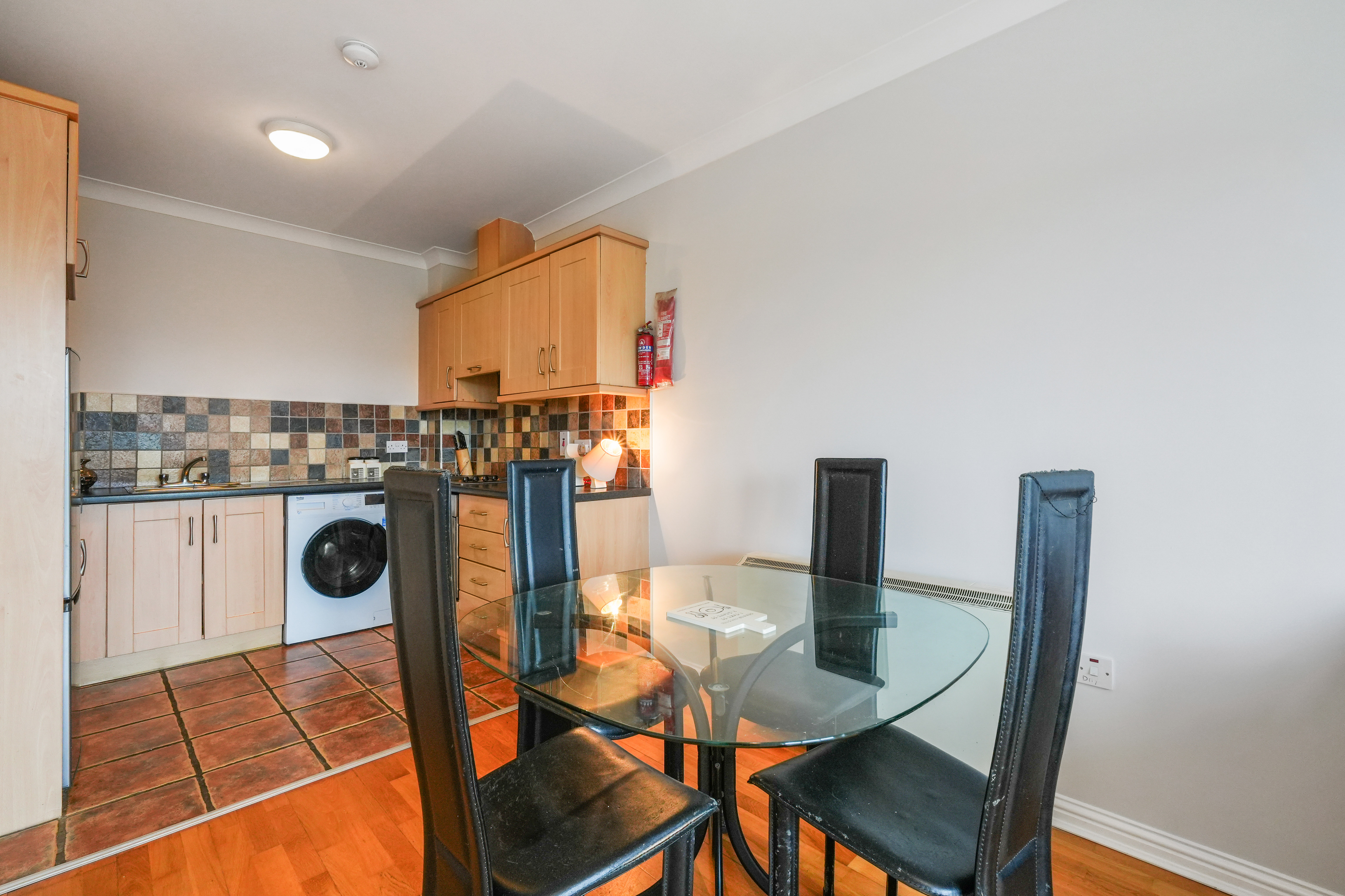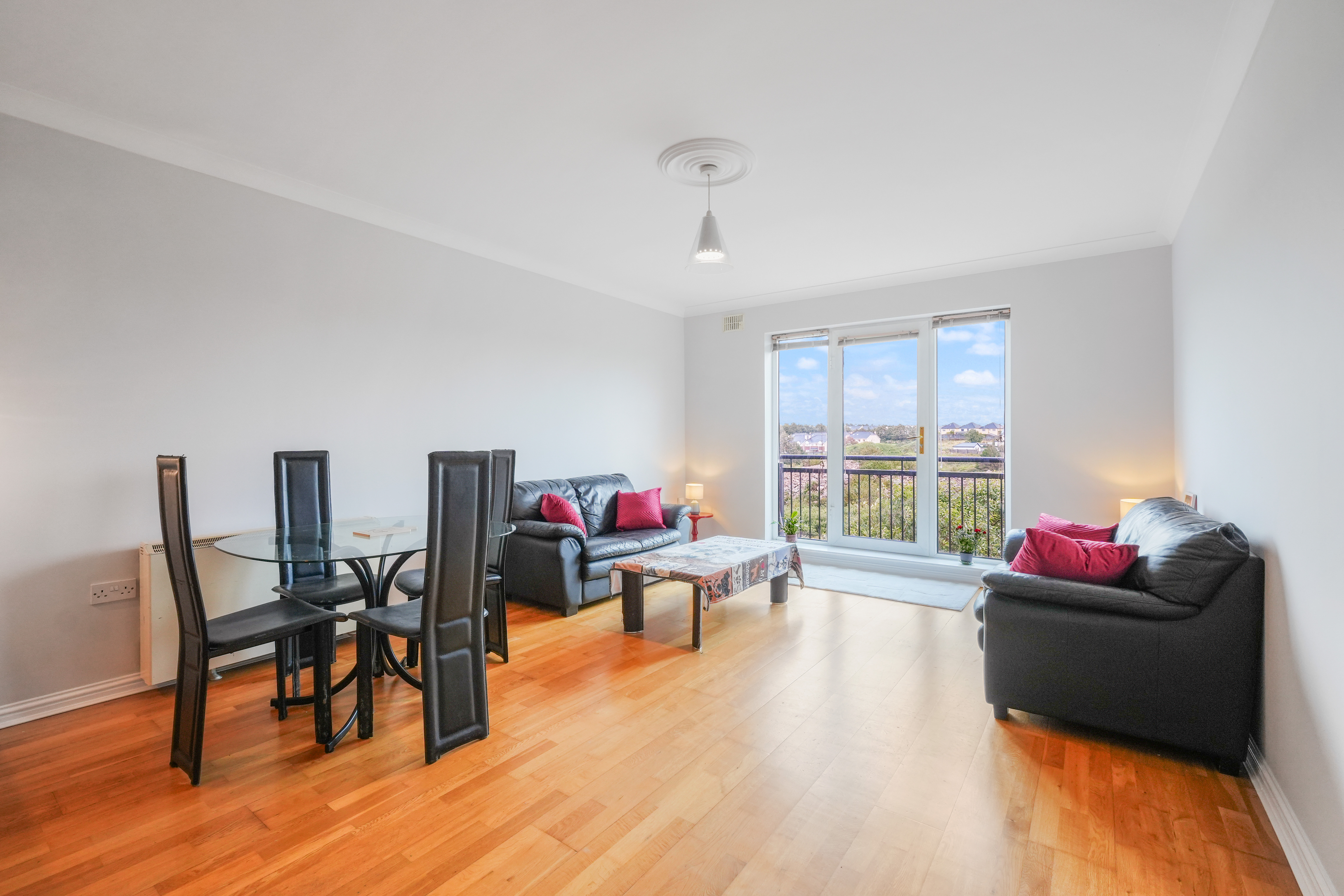 The property is presented in excellent condition, having been carefully maintained by the current owner. The accommodation comprises a large, welcoming entrance hallway leading into a bright, open-plan living and dining area, perfect for both everyday living and entertaining. From the living area, there is access to a sleek private balcony that overlooks a peaceful green area and benefits from excellent sunshine throughout the day, an ideal space for unwinding or enjoying a morning coffee in the sun.