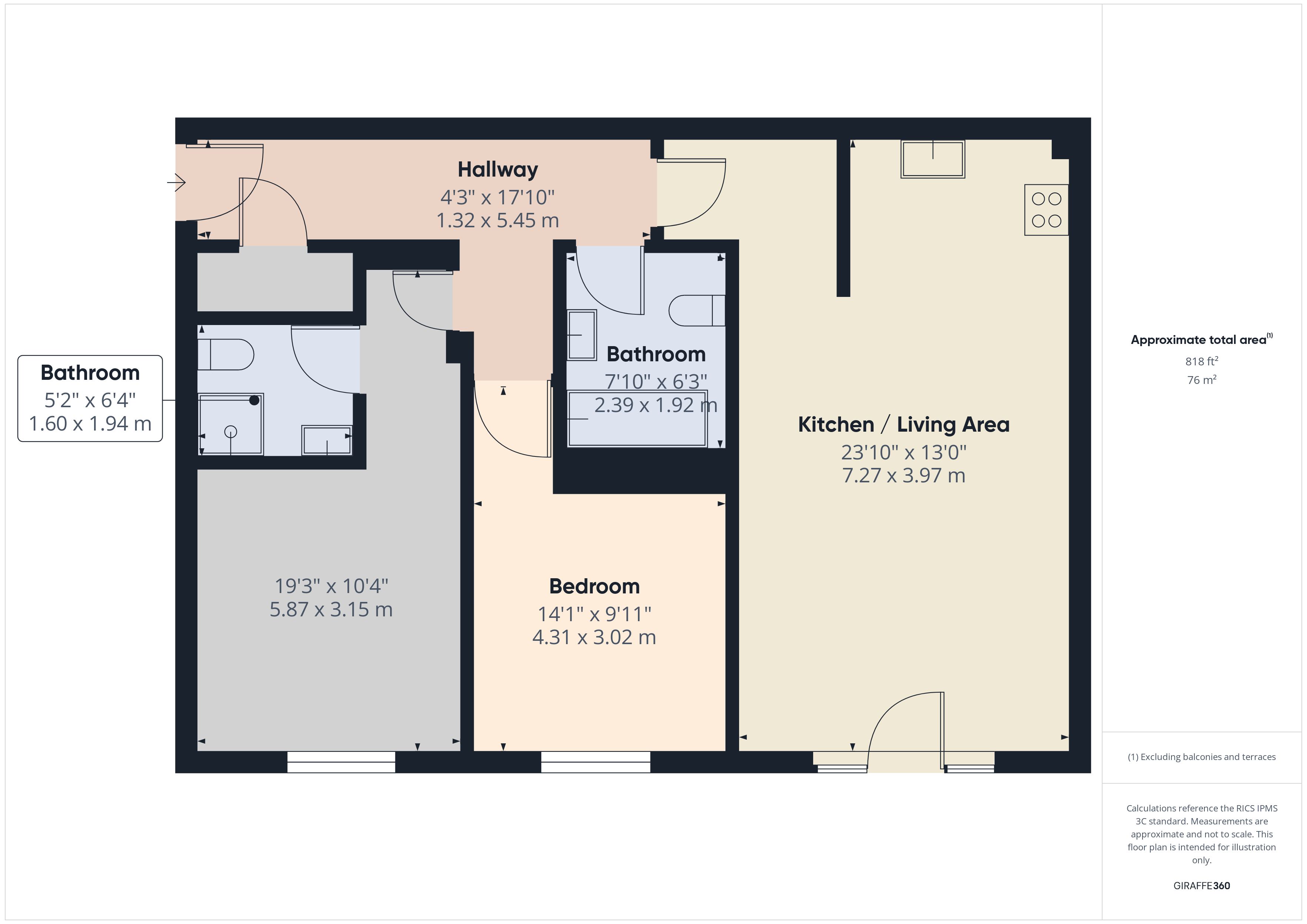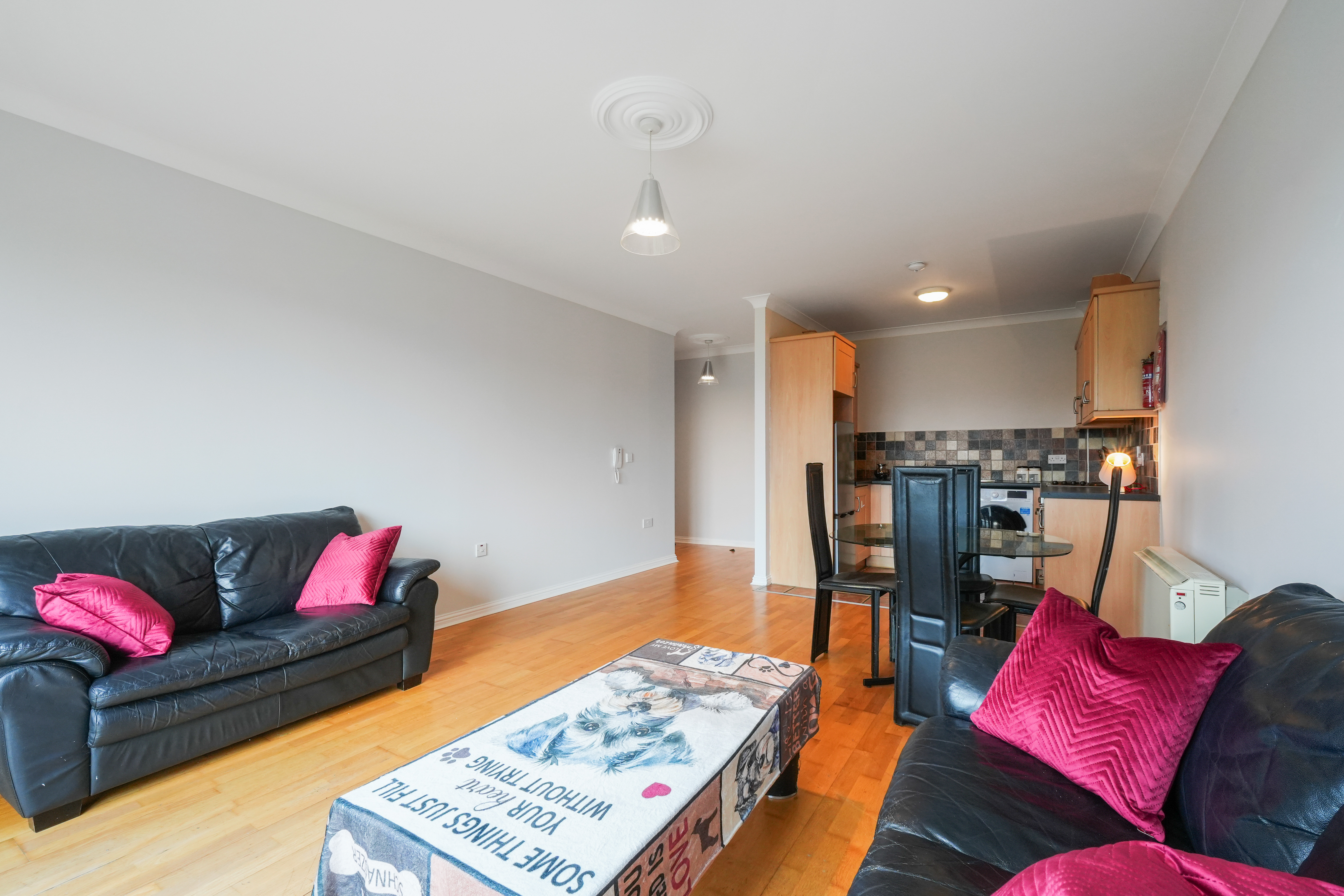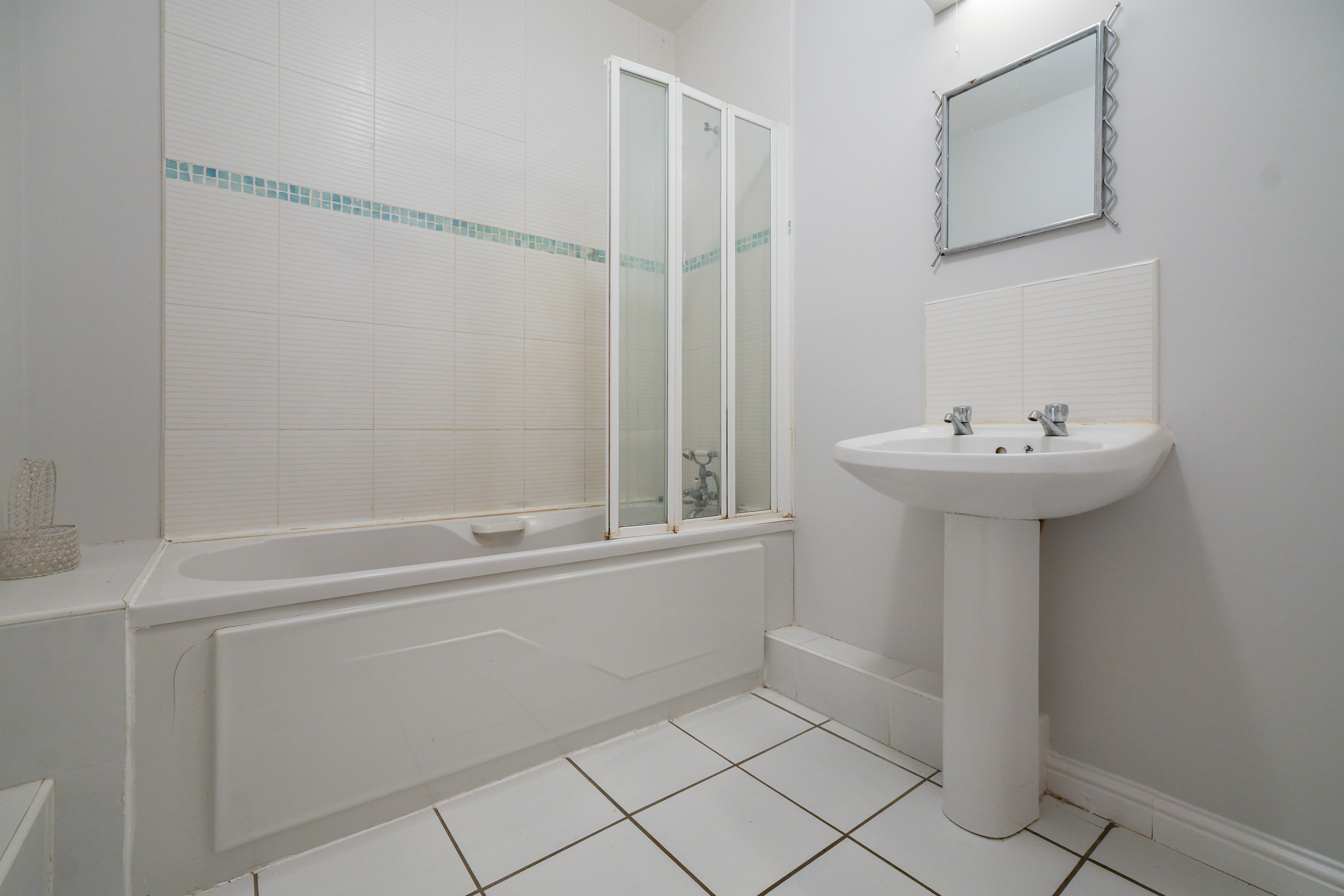 The apartment features two generously sized double bedrooms, both with floor-to-ceiling fitted wardrobes, offering ample storage. The primary bedroom includes a stylish, fully tiled en-suite shower room, while the main bathroom-also tastefully finished-features both a bath and overhead shower.