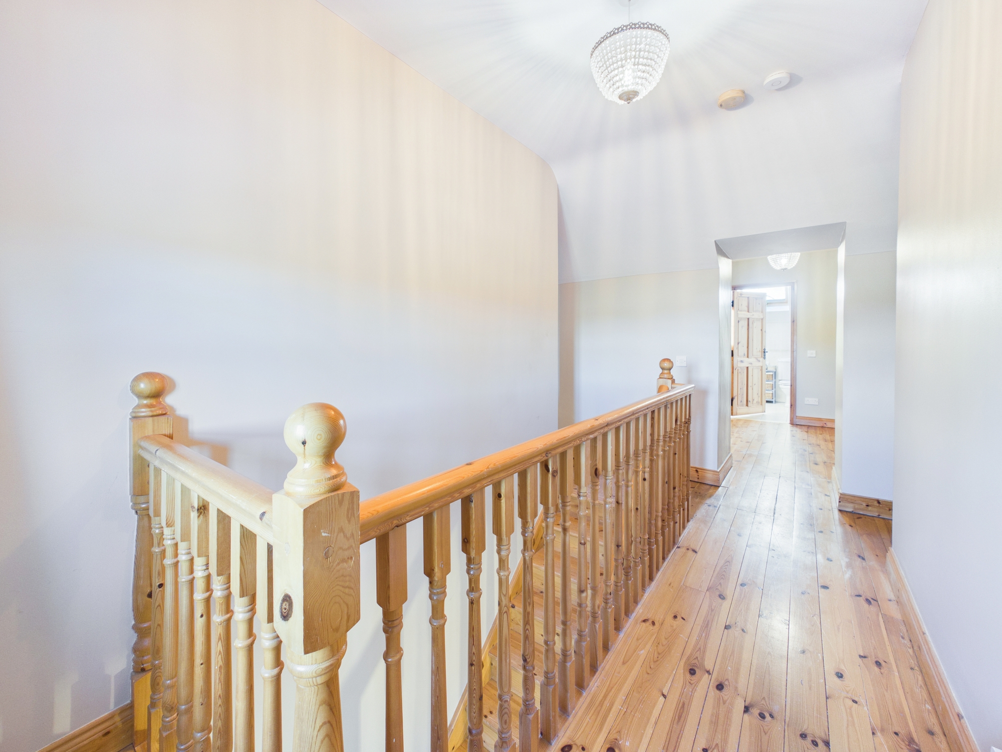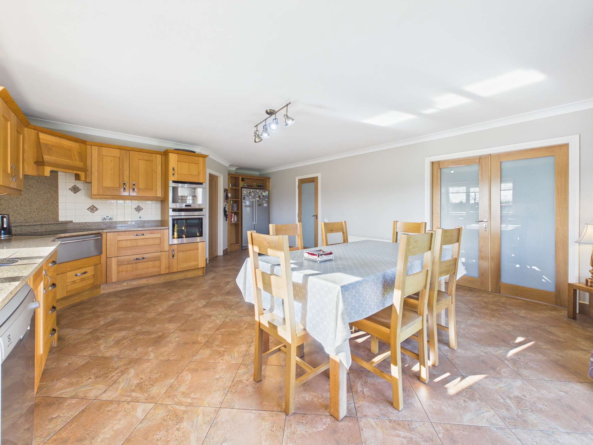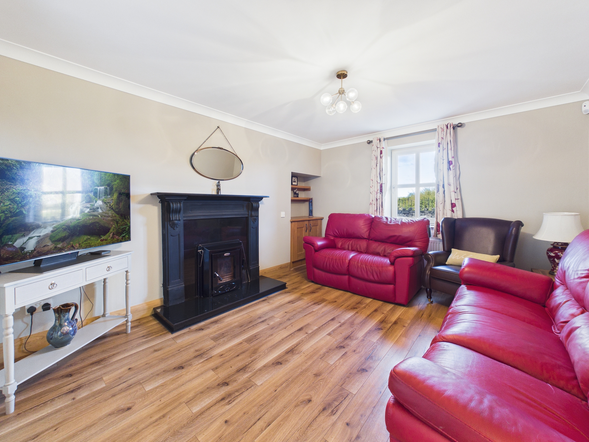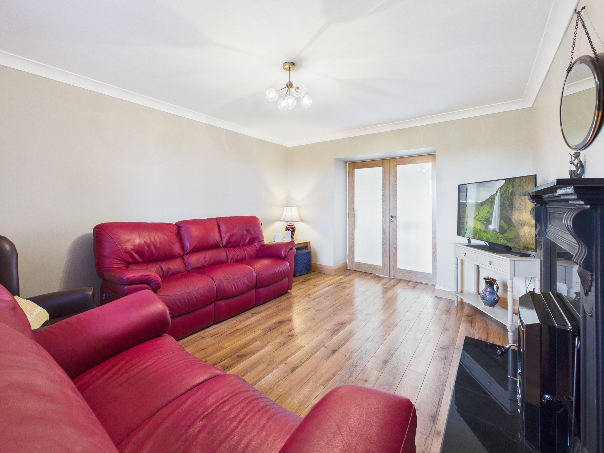 On entering, you are welcomed by a bright tiled entrance hallway where elegant coving is a notable feature throughout the ground floor. A spacious living room with recently installed timber flooring provides a warm and inviting setting, while the large kitchen and dining area forms the heart of the home, complete with Neff integrated appliances and French doors opening onto the garden. An additional large window floods this space with natural light, creating a wonderful atmosphere for everyday family living and entertaining. A cosy sitting room with feature fireplace and built-in stove offers a relaxing retreat, and the generous utility room provides extensive additional storage with fitted units, sink and laundry facilities. A fully tiled floor to ceiling guest WC completes the ground floor accommodation.