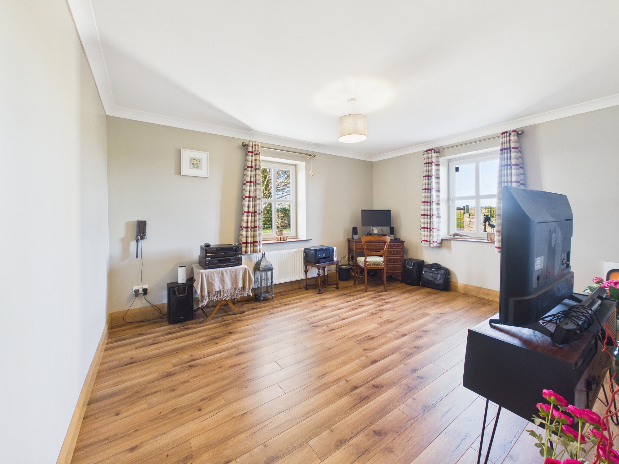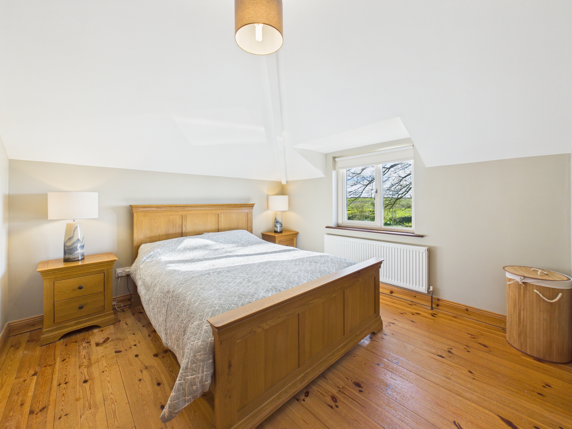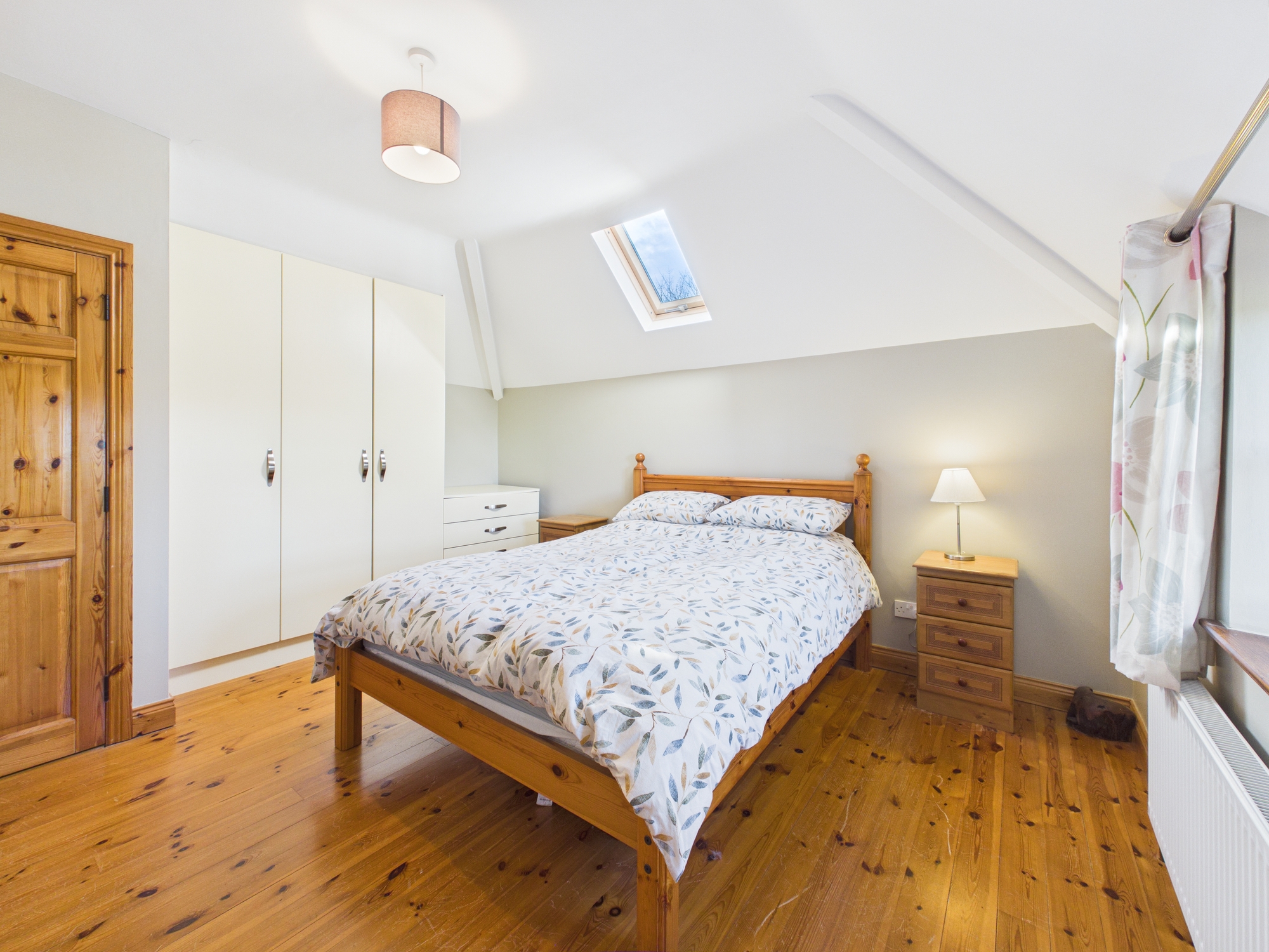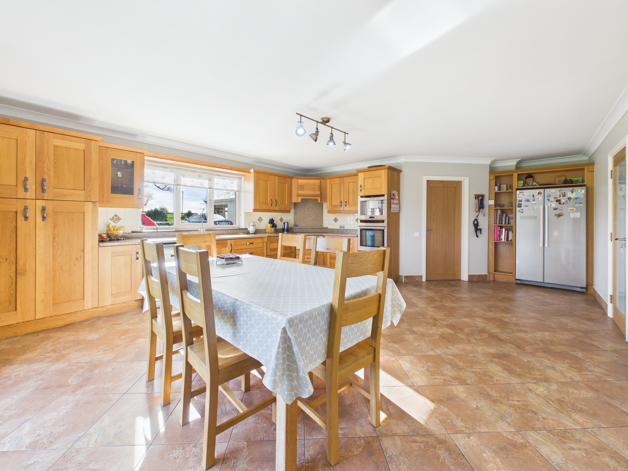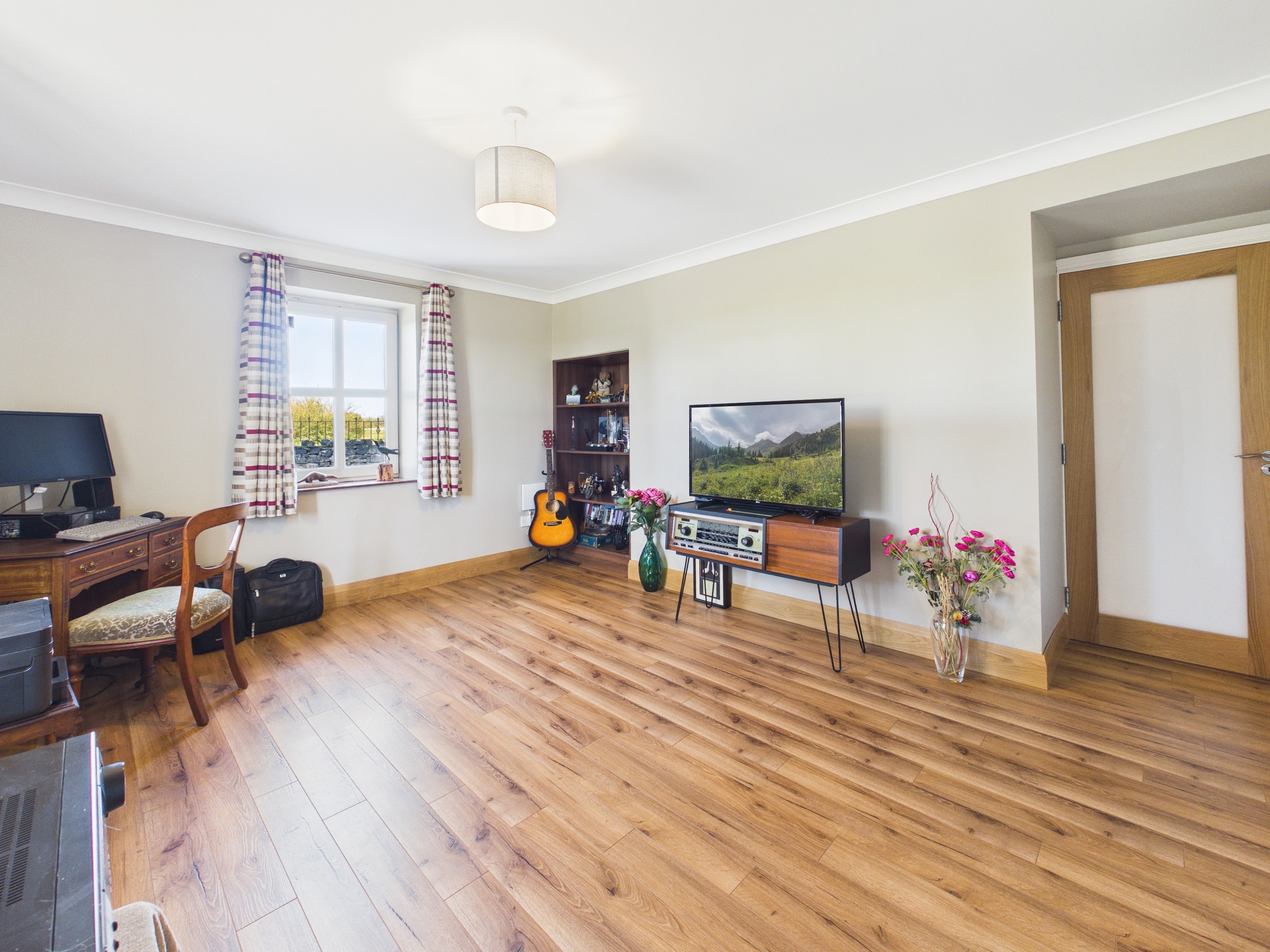 On entering, you are welcomed by a bright tiled entrance hallway where elegant coving is a notable feature throughout the ground floor. A spacious living room with recently installed timber flooring provides a warm and inviting setting, while the large kitchen and dining area forms the heart of the home, complete with Neff integrated appliances and French doors opening onto the garden. An additional large window floods this space with natural light, creating a wonderful atmosphere for everyday family living and entertaining. A cosy sitting room with feature fireplace and built-in stove offers a relaxing retreat, and the generous utility room provides extensive additional storage with fitted units, sink and laundry facilities. A fully tiled floor to ceiling guest WC completes the ground floor accommodation.