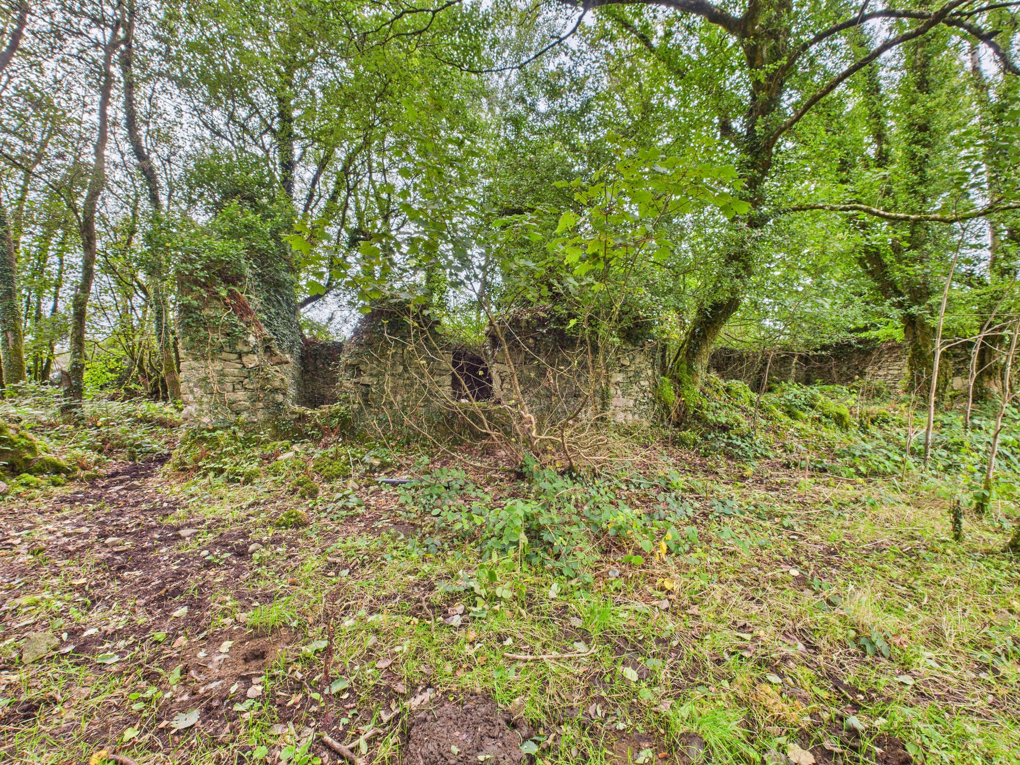 Externally, the property is surrounded by mature lawns to the front and rear, complemented by woodlands, a derelict stone outbuilding with potential, and a gated gravel driveway.