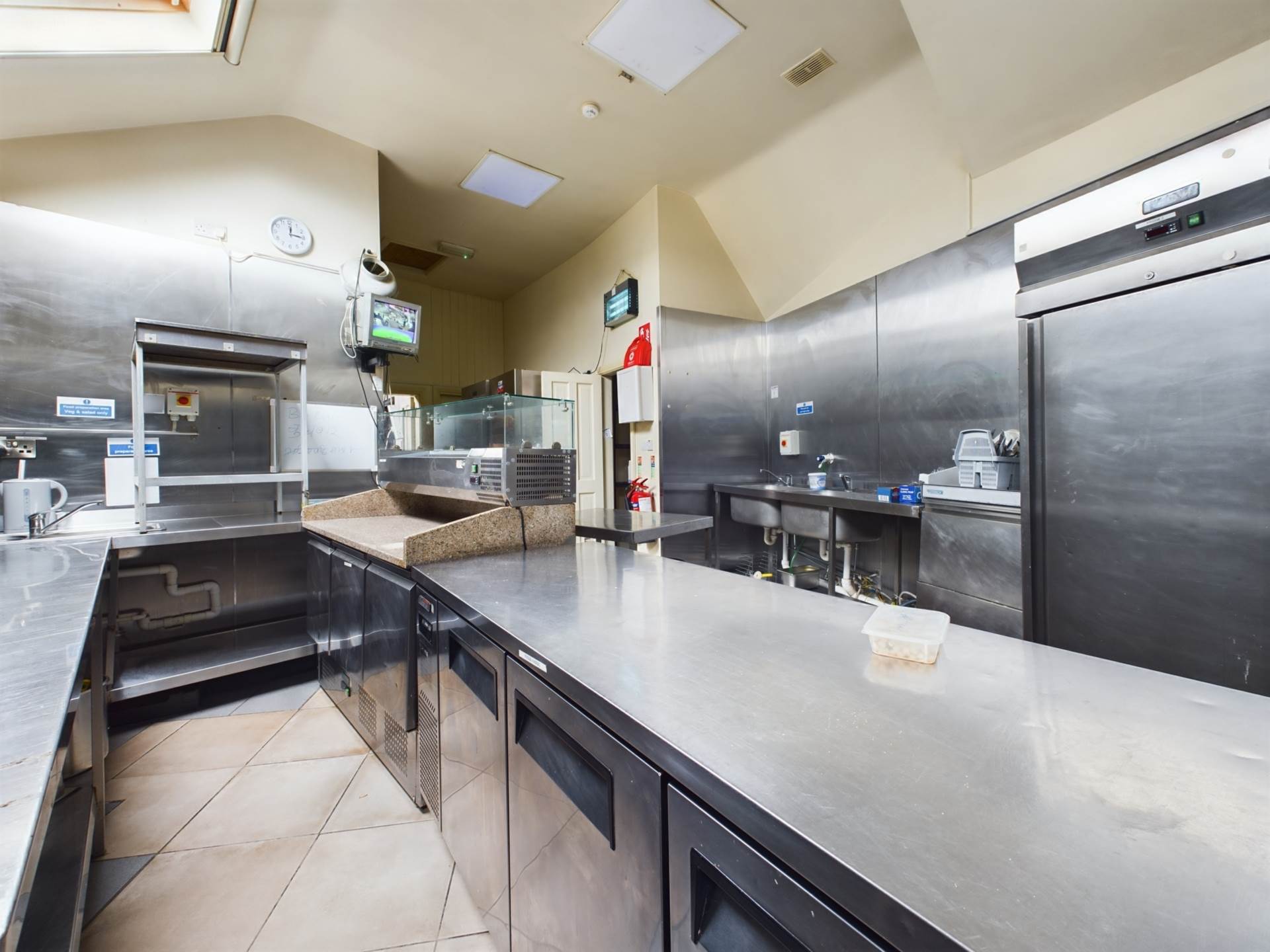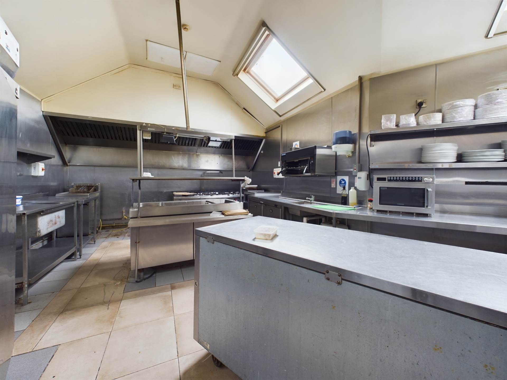 The property comes fully equipped with a fully kitted-out kitchen that previously operated as a restaurant, offering significant potential for food service and events.